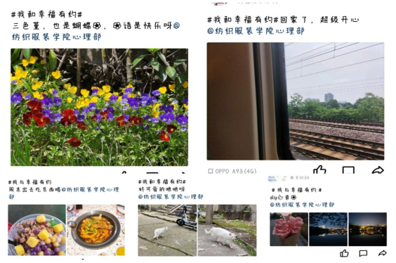 “我和幸福有约”线上主题打卡活动持续十四天,活动要求以每日打卡的形式记录自己在日常生活中遇到的小美好、小确幸。同学们纷纷分享生活和学习中与美好撞个满怀的时刻,写下心中的幸福:“幸福来源于美食呀~~”“以欢喜之心,慢度日常”“大好年光与湖色,一尊烟雨杏花楼”“好心情是未知名的花给的”......活动期间内,100余名同学参与了打卡活动,累计打卡1200余次。