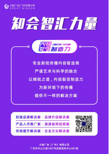 大智团队善于以侧翼和蓝海的思维角度,通过本土语境呈现,注重品牌长期投资的整体性和关联度,透过品牌文化轴心,提供包括实效营销策划、实效视觉解决方案、创新影视制作、公众形象策划、终端形象设计、品牌落地活动策划执行、与媒体传播策划等加以全线整合,将统一清晰的资讯传播给消费者,为客户获得长期的品牌竞争优势,实现品牌价值最大化,在提高短期销售额的同时,体现客户的长期品牌价值。