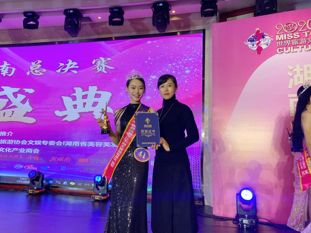 本届世界旅游文化小姐大赛湖南总决赛改变单一选美制模式,通过开场古装秀,潇湘智慧秀,潇湘才艺秀,潇湘风韵旗袍秀,盛世礼赞晚礼秀等几大环节展开精彩而激烈的角逐。我们41号朱佳怡同学凭借出众的气质以及聪明的才智在舞台上演绎了别具韵味的中国女性自信、优雅之美,受到评委和现场观众的一致认可,荣获亚军荣誉。
