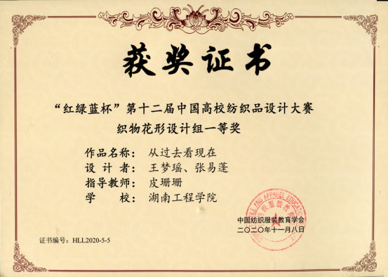 2020年11月7日,由中国纺织服装教育学会主办的“红绿蓝杯”第十二届中国高校纺织品设计大赛作品评审会在绍兴文理学院河西校区举行。我们Betway必威西汉姆联学子喜获佳绩,一等奖两项,二等奖四项,三等奖九项。其中,王梦瑶、张易蓬同学的作品《从过去看现在》(指导老师:皮珊珊)和黄仕卿、熊紫吟、李娜同学的作品《微*不微》(指导老师:周琪)荣获一等奖。