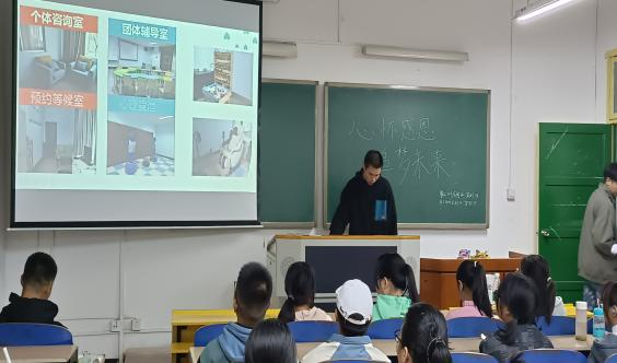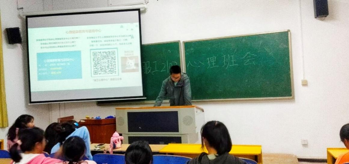 会议上,主持人给同学们介绍了宣传心理咨询室地址、咨询预约电话、咨询值班安排,并宣传“心理健康教育与咨询中心”的微信公众号,要求学生关注微信公众号。主持人面对全班宣读“心理健康教育与咨询中心致新生的一封信”。最后主持人在班级宣传“心理情景剧大赛”。