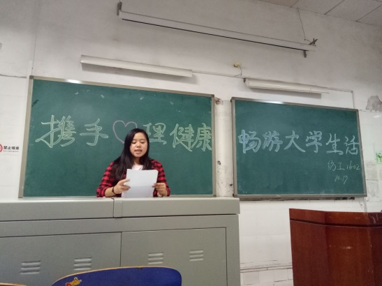为了帮助同学们更加快乐、充实、有意义地度过自己的大学生活,引导对心理健康的关注与思考,提升自我心理健康水平,并积极主动地关爱他人,形成良好的自助、互助和求助的氛围。我们2014级、2015级、2016级各班级于10月17日——10月28日晚,陆续在红楼、电教举行了以“携手心理健康 畅游大学生活”为主题的心理班会。