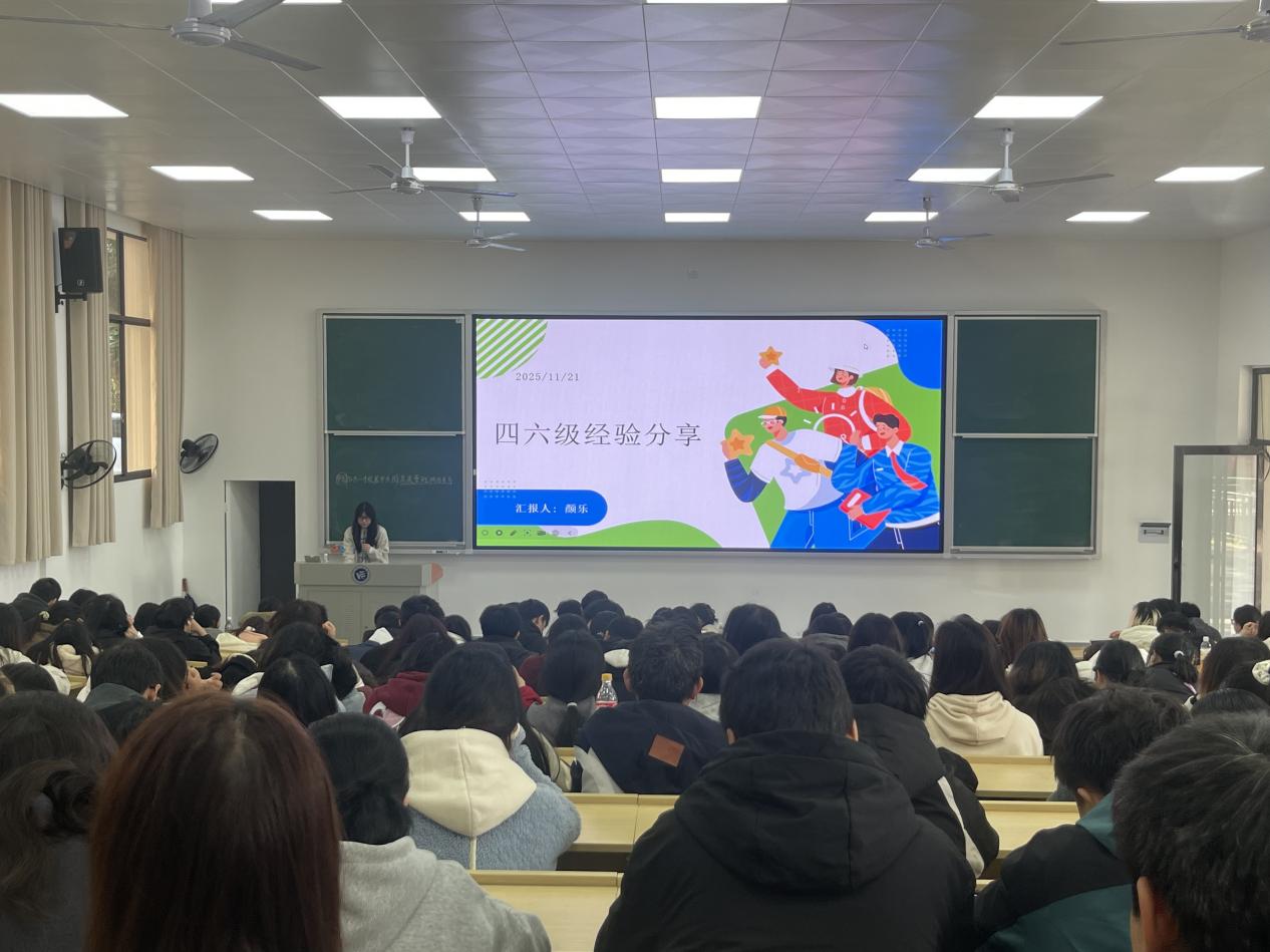 为扎实推进学风建设,助力学生高效备战大学英语四六级考试,2025年11月21日中午,Betway必威西汉姆联在电教楼105教室成功举办英语四六级经验分享会。本次活动特邀五位在考试中取得优异成绩的学生代表担任主讲,面向全院近200名学生分享实战经验与方法心得。