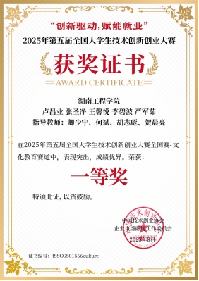 近日,由中国技术创业协会指导、中国技术创业协会企业市场融通工作委员会主办的2025年第五届全国大学生技术创新创业大赛中,我们卢昌业、张圣净、王馨悦、李碧波、严军茹组建的参赛团队,在指导教师卿少宁老师、何斌老师、胡志彪(企业导师)、贺晨亮老师的带领下,凭借“三色织新绿:湖湘非遗纺织服装技艺的生态转化与可持续设计研究”项目,在文化教育赛道脱颖而出,荣获全国赛一等奖。